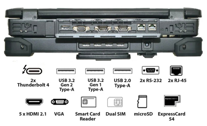 La Durabook Z14I-HG intègre les GPU NVIDIA® RTXTM 3500 Ada ou RTXTM 5000 Ada en option, offrant jusqu'à 9.728 cœurs CUDA et 16 Go de mémoire GDDR6 (Graphics Double Data Rate 6) avec ECC. Cela fournit plus de 3X les performances graphiques des solutions robustes actuellement disponibles, prenant en charge des charges de travail avancées, y compris le rendu 3D en temps réel, la modélisation jumelle numérique, la visualisation SIG et géospatiale et les simulations d'ingénierie complexes. Avec une bande passante de mémoire allant jusqu'à 576 Go/s, le système peut traiter de grands ensembles de données et des modèles détaillés directement sur le terrain. La Durabook Z14i-HG fournit une connectivité d'affichage de pointe pour les systèmes robustes, prenant en charge jusqu'à quatre sorties HDMi 2.1 pilotées par NVIDIA pour 4K à 120Hz ou 8K à 60Hz, un HDMi 2.1, VGA et 2 ports Thunderbolt 4. Contrairement aux systèmes robustes concurrents où les GPU n'accélèrent que les charges de travail de calcul, la Durabook Z14I-HG permet une sortie d'affichage complète pilotée par GPU, prenant en charge des configurations de visualisation multi-écrans complexes.