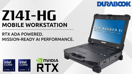 Annoncée aux USA, en Avril 2026, la Durabook Z14i-HG intègre l'architecture NVIDIA® RTXTM Ada, qui permet de rivaliser avec les meilleurs postes de travail, tout en étant ultra robuste pour les applications sur le terrain. L'accélération avancée de l'IA et ses performances de visualisation haut de gamme permettent des charges de travail des plus avancées. Les applications comprennent l'inspection et la surveillance alimentées par l'IA et l'analyse et la cartographie géospatiale utilisées dans de nombreux secteurs; les opérations de défense et le commandement tactique mobile pour l'armée et les gouvernements; l'automatisation industrielle et la fabrication intelligente; l'ingénierie de terrain, la construction et la maintenance des infrastructures; et les services professionnels. Les organisations peuvent exécuter l'analyse de l'IA, la vision par ordinateur et la visualisation 3D directement sur le terrain, fournissant des informations sans délai, réduisant la latence et améliorant l'efficacité opérationnelle.