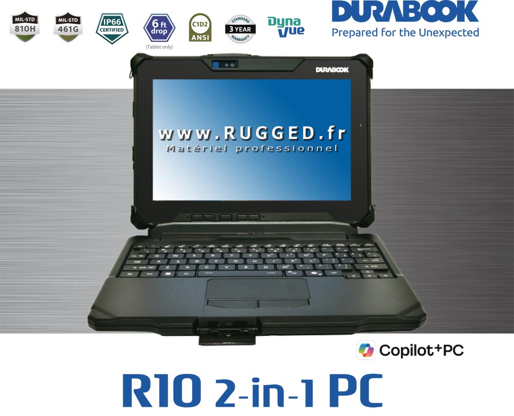 La tablette durcie étanhce Durabook R10 redéfinit la mobilité robuste grâce à une informatique de nouvelle génération conçue pour les professionnels exigeant Puissance, adaptabilité et Fiabilité en environnement critique. Basée sur les processeurs Intel® Core™ Ultra 200V Series, la tablette durcie Durabook R10 allie accélération de l’IA (Intelligene Artificielle), sécurité avancée et design polyvalent dans un format compact de 10,1 pouces.
