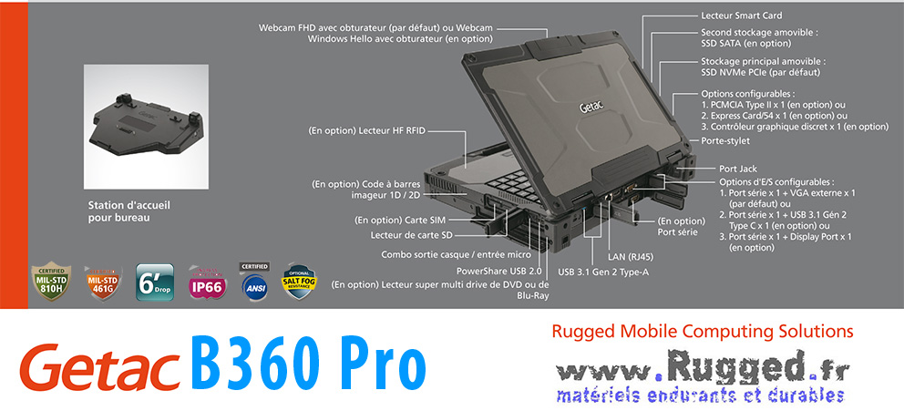Le Getac B360 PRO G3 est un pc-portable Antichoc Antichute Antivibration étanche iP66 utilisable sous la pluie