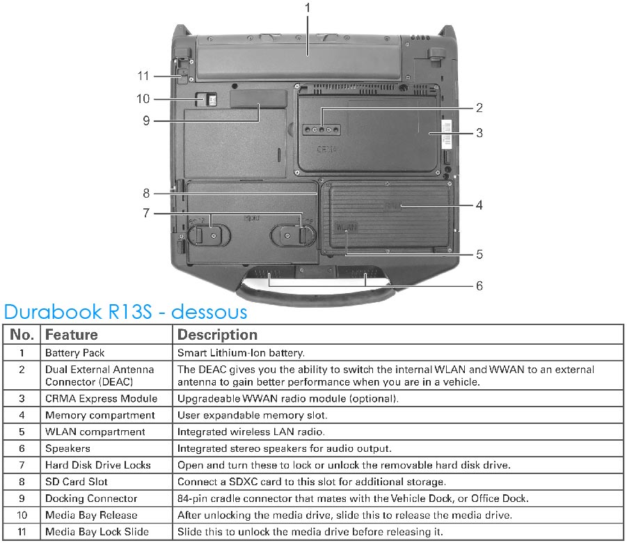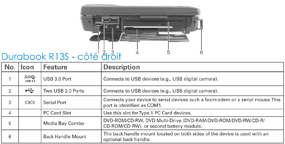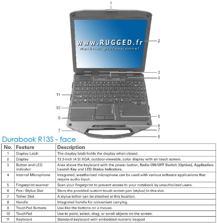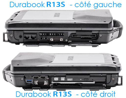 Boîtier ultra robuste en magnésium MIL-STD 810G - avec poignée - ultra résistant aux chocs et aux chutes jusqu'à 1,8 mètres, aux pressions de 100 kg fermé (protection de l'écran pendant le transport), antivibration (utilisable en mouvement et en altitude), complètement étanche iP65 (tropicalisé / utilisable sous pluie battante). Ordinateur pc portable ultra durci étanche avec écran Tactile de 13,3 pouces ultra haute Luminosité Lisible en extérieur PLEIN SOLEIL SR 1000 nits. intel Wifi AC, Bluetooth, double ports RJ45 et un port série RS232 natifs. Le Durabook R13S est un PC portable Ultra durci 100% étanche qui vous accompagne partout sans soucis (possibilité double batteries internes). Configuration sur-mesure: processeur intel Core i5 SkyLake de 6ème génération compatible Windows 7 pro et Windows 10 pro , disque dur ssd mlc pro, mémoire vive jusqu'à 32 Go, gps satellitaire, internet Mobile 4G Lte, double ports RS232 ...etc