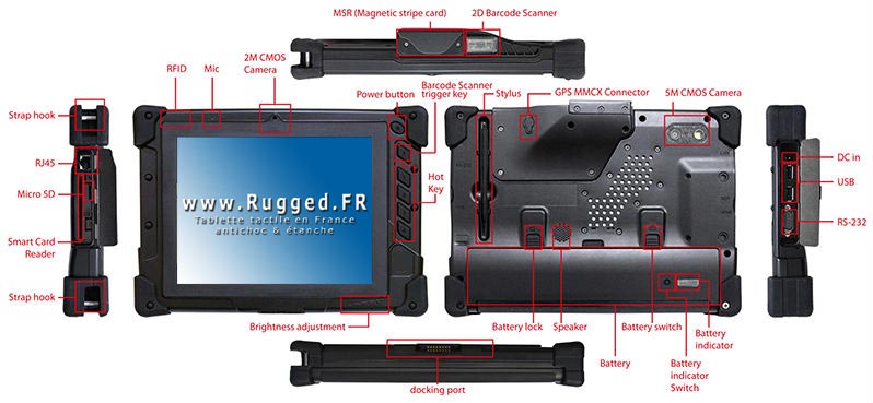 Cette Tablette pc Tactile est une tablette de 8 pouces ultra durcie et complètement étanche (utilisable sous la pluie). La RedTop RTS-B8 est une Tablette Tactile qui est entièrement étanche à l'eau et aux poussières suivant la norme IP 65, aux vibrations et aux chocs du quotidien, et ne craint pas les chutes de 120 cm (1,2 mètres), ce qui lui permet d'être utilisée dans des environnements contraignants et en extérieur. |