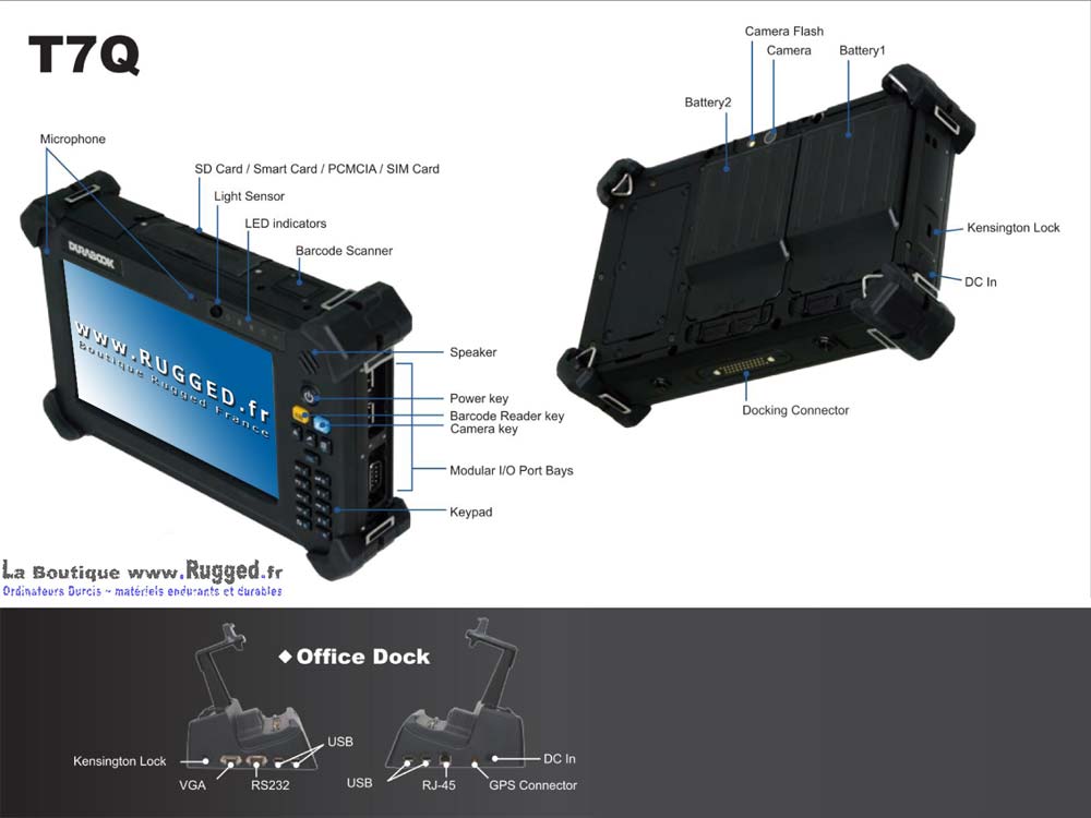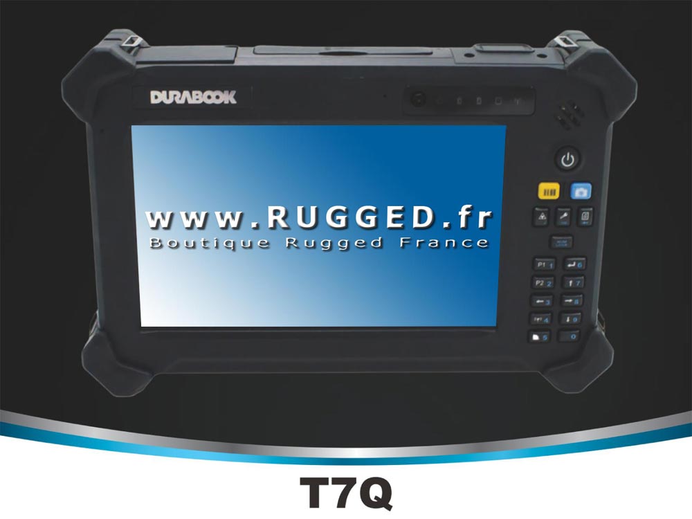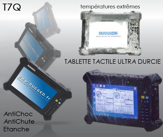 La tablette pc tactile Durabook T7Q de Twinhead est Antichoc Antichute Antivibration et totalement Etanche (utilisable sous la pluie - tablette tropicalisée), sans ventilateur (fanless). WiFi, Bluetooth, GPS et WANN, 2 ports usb, port série RS232, lecteur carte SD ...etc
