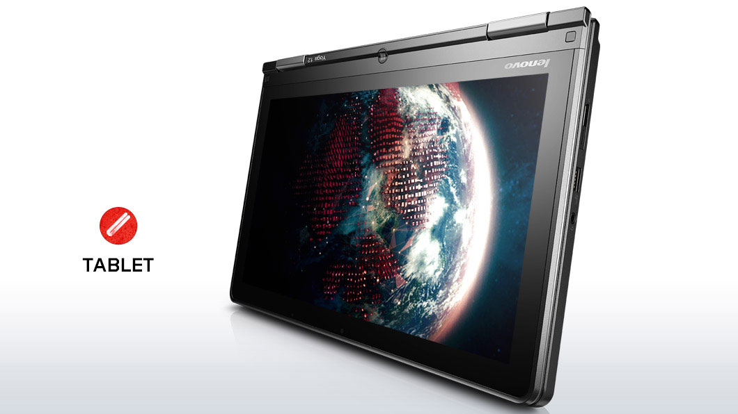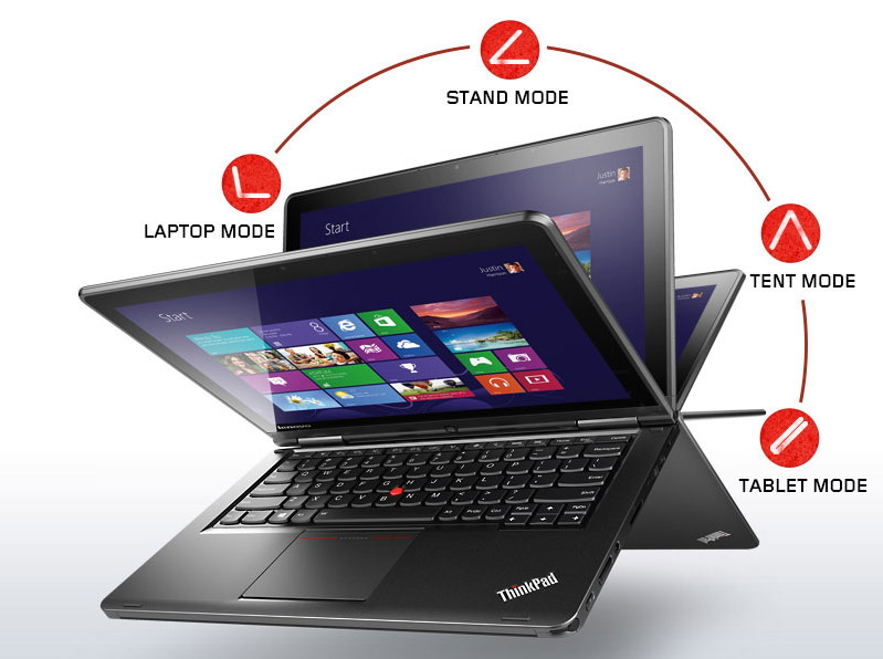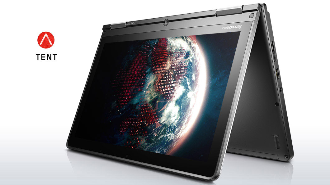 Le Thinkpad Yoga 14 de Lenovo dispose d'un écran tactile HD ou FULL HD réversible de 14 pouces, utilisable suivant 4 modes au choix : ordinateur portable tactile, tablette tactile, Chevalet tactile (Stand) ou Tente tactile.