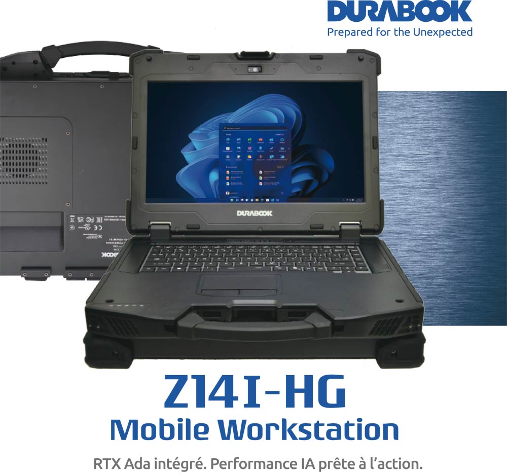 Annoncée aux USA, en Avril 2026, la Durabook Z14i-HG intègre l'architecture NVIDIA® RTXTM Ada, qui permet de rivaliser avec les meilleurs postes de travail, tout en étant ultra robuste pour les applications sur le terrain. L'accélération avancée de l'IA et ses performances de visualisation haut de gamme permettent des charges de travail des plus avancées. Les applications comprennent l'inspection et la surveillance alimentées par l'IA et l'analyse et la cartographie géospatiale utilisées dans de nombreux secteurs; les opérations de défense et le commandement tactique mobile pour l'armée et les gouvernements; l'automatisation industrielle et la fabrication intelligente; l'ingénierie de terrain, la construction et la maintenance des infrastructures; et les services professionnels. Les organisations peuvent exécuter l'analyse de l'IA, la vision par ordinateur et la visualisation 3D directement sur le terrain, fournissant des informations sans délai, réduisant la latence et améliorant l'efficacité opérationnelle.