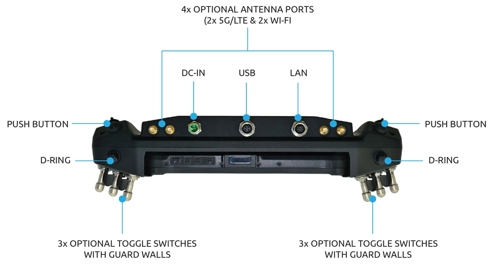 | 1 x USB3.2 type C support DP (tablette) 1 x USB3.2 gen1 type A (option* tablette) 1 x THUNDERBOLT4 (tablette) 1 x USB2.0 M12 Mil (station) |