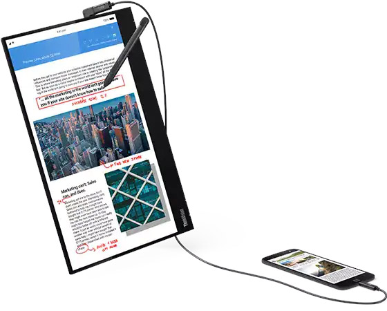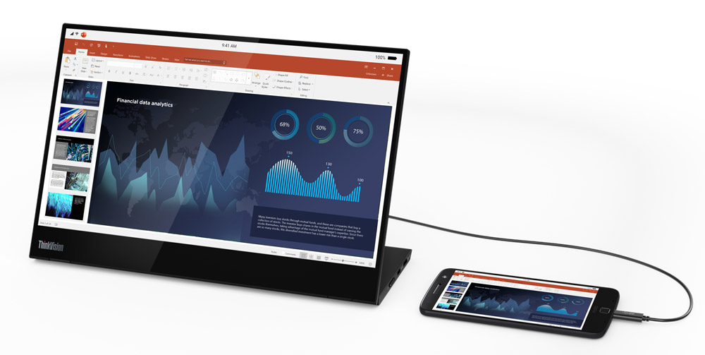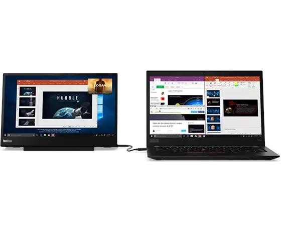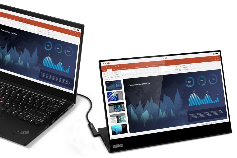 L'écran portable lenovo ThinkVISION M15 vous permet d’être pluS productif sur 2 espaces d'affichage. Grâce à la surface d’affichage étendue, des tâches telles que la comparaison de feuilles de calcul détaillées est bien plus facile, le multitâche devient un jeu d’enfant et des collègues ou des vendeurs peuvent transférer l’affichage sur un deuxième écran ou l’agrandir pour présenter le contenu de leur propre écran à des clients potentiels, en face à face, même dans des espaces publics. Le socle pliable intégré du ThinkVISION M15 est réglage en hauteur et en inclinaison. Le moniteur s’aligne facilement avec l’écran d’un portable, pour une expérience utilisateur la plus fluide possible.