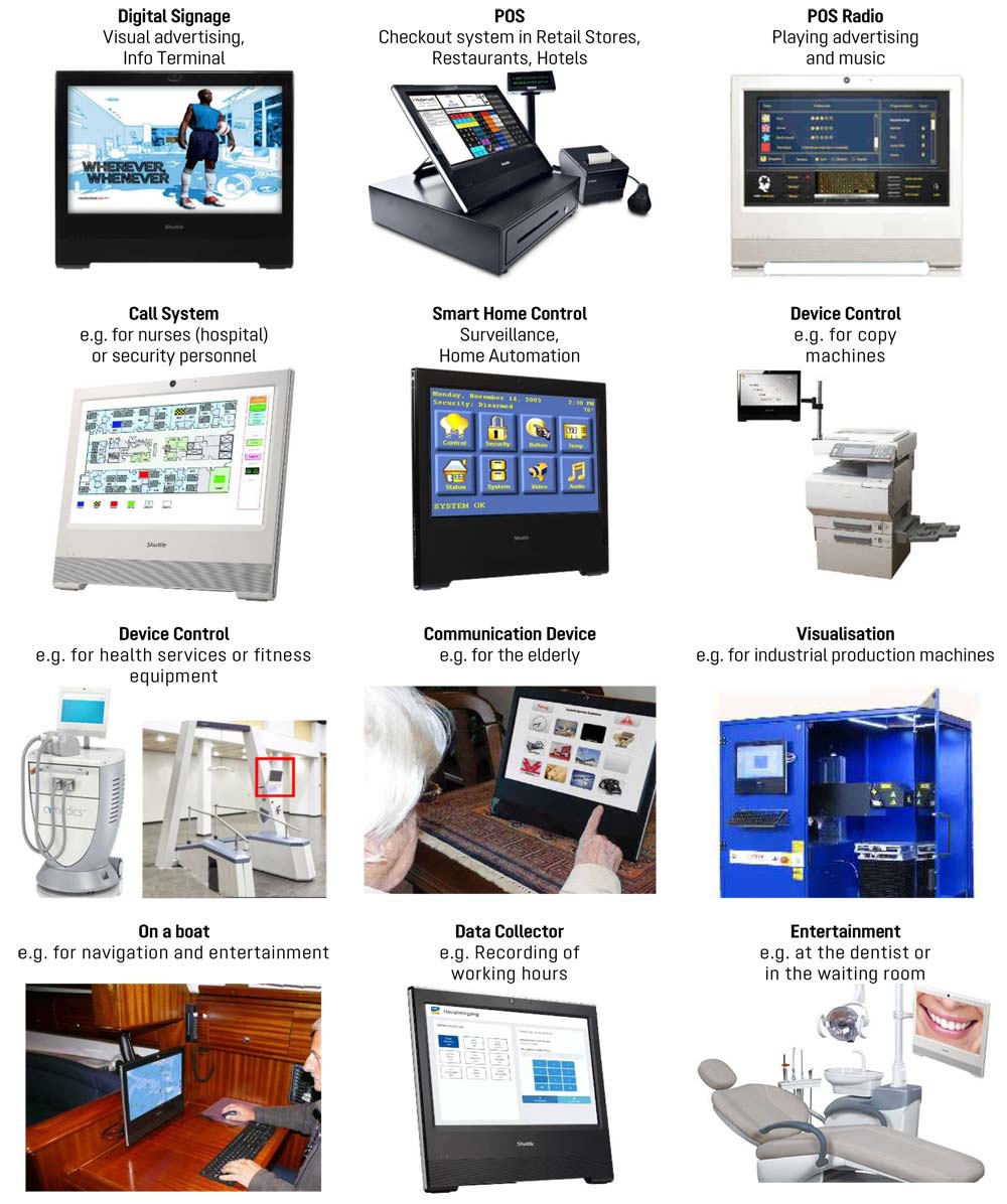 Choix idéal pour les applications destinées au public, dans les domaines des soins et de la santé, le secteur hôtelier, l'affichage numérique (Digital Signage), les points de vente POS, les kiosques d'information, dans le commerce et l'industrie.