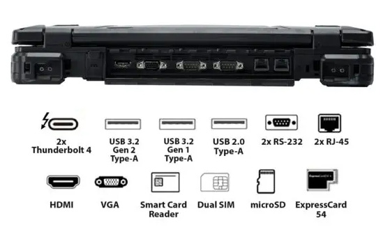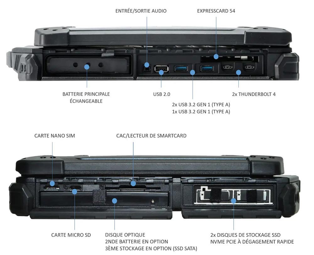 UNE CONNECTIVITÉ ET UNE SÉCURITÉ SUPERBES Summum en matière de polyvalence pour appareils connectés, le Durabook Z14 G3 offre différents types d’interfaces avec de nombreux modules complémentaires, dont deux USB-C Thunderbolt 4, deux ports RJ-45, deux ports série RS-232, ExpressCard 54 et double SIM (un emplacement Nano SIM et une eSIM). Par ailleurs, les options USB offrent toutes les capacités de l’USB 3.2 Gen2 à l’USB 2.0.
